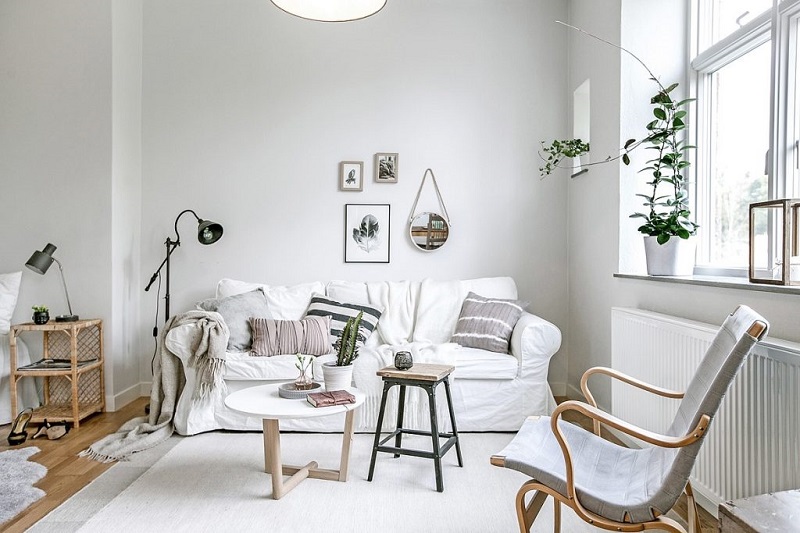 Một góc nhỏ được biến hóa đậm chất phong cách nội thất Bắc Âu. Ghế sofa màu trắng, sự xuất hiện của lông thú, thảm trải sàn đủ để đem lại hiệu ứng sắc nét cho căn phòng nhỏ. Phòng khách tràn ngập ánh sáng với một bố cục thoáng đãng đến khó tin. Tinh tế, chỉ với sự xuất hiện của hai tông màu chính là màu trắng sữa và màu đen. Các chi tiết trang trí đều được bài trí theo bố cục có sự điều chỉnh về số lượng. Không gian căn phòng thoáng đãng, không cầu kỳ nhưng tràn ngập sự lãng mạn và tinh tế.