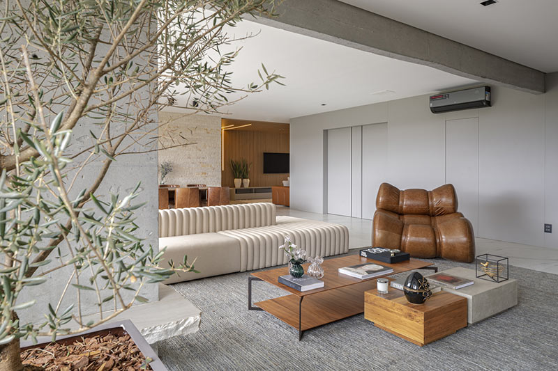 Sự mộc mạc của khoảng tường với giấy dán tường giả gạch mộc như thật, kết hợp với hệ thống cửa kính rộng mở và nội thất hiện đại sáng màu, đủ tinh tế để xây dựng một khoảng riêng tư mang đậm phong cách cá nhân. Thảm trải sàn màu nâu đậm, kích thước tuy không lớn nhưng sự khác biệt về màu sắc đã giúp khoảng trống được lấp đầy, thay vào đó là một sự phức hợp đồng điệu đến khó tin.