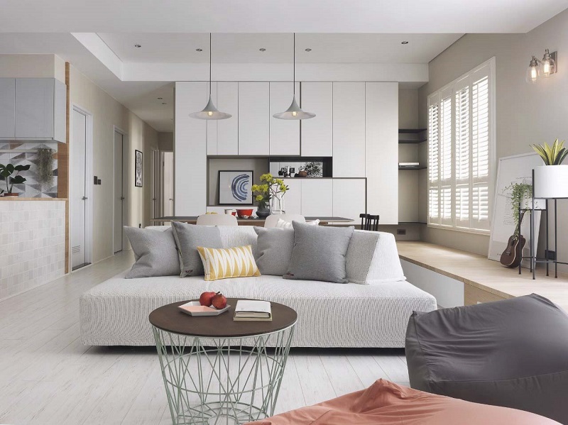 Đơn giản hóa và cụ thể hóa các chi tiết, không gian phòng khách ghi điểm nhấn một cách đầy ấn tượng. Ghế sofa màu trắng mềm mại, những chiếc gối tựa nhỏ xinh đặt trên thảm lớn màu be hiện đại, không gian căn hộ trông gọn gàng đến ngỡ ngàng. Việc sử dụng tranh treo tường và đèn trang trí kiểu đứng, hệ thống kệ để đồ ngay bên cạnh, góp phần ghi điểm, tạo sự khác biệt so với các phối cảnh khác khi thiết kế thi công nội thất.