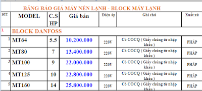 Giá bán tham khảo block máy lạnh Danfoss model MT , MTZ , hàng nhập khẩu chính hãng , có COCQ đi kèm , giá cả phù hợp .