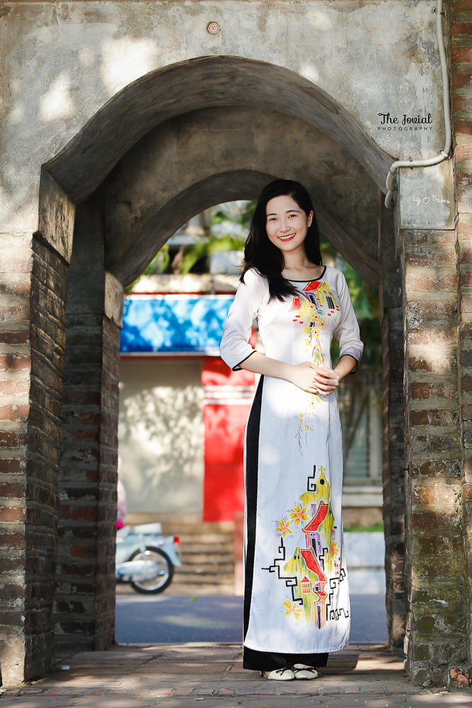Với cảm hứng thiết kế nghiêng hẳn về nét đẹp truyền thống của Hà Nội, tàáo dài kỷ yếuin tranh phố cổ không chỉ khiến người mặc xuất hiện với vẻ đẹp tự nhiên, trong sáng mà còn thấm đượm nét thanh lịch của người Tràng An.