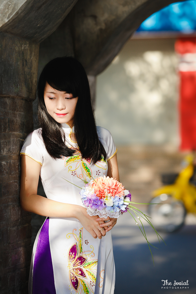 - Với trang phục áo dài đơn giản bạn cũng không nên trang điểm hoặc sử dụng phụ kiện quá cầu kì rườm rà sẽ không phù hợp. Bạn có thể để kiểu tóc đơn giản, trang điểm nhẹ nhàng nhưng chú ý tone màu mắt, son và má hồng để làm nổi bật thần thái xinh tươi khi chụp ảnh.