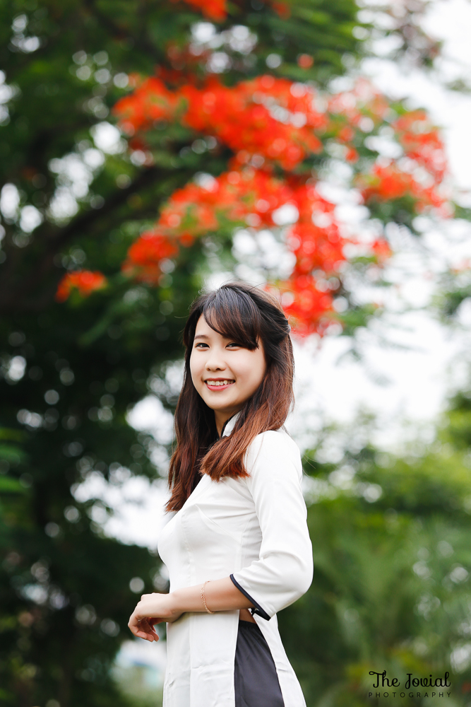 Còn gì dịu dàng và tuyệt vời hơn một mái tóc đen buông xõa bên tà áo dài đẹp này? Bạn đừng trang điểm quá đậm, lòe loẹt sẽ khiến mất đi vẻ đẹp tự nhiên khi chụp ảnh kỷ yếu. Hãy tinh tế chọn cho mình các phụ kiện chụp ảnh đi cùng để khoe trọn vẹn vẻ đẹp hài hòa, hoàn hảo của mình bên tà áo này nhé!