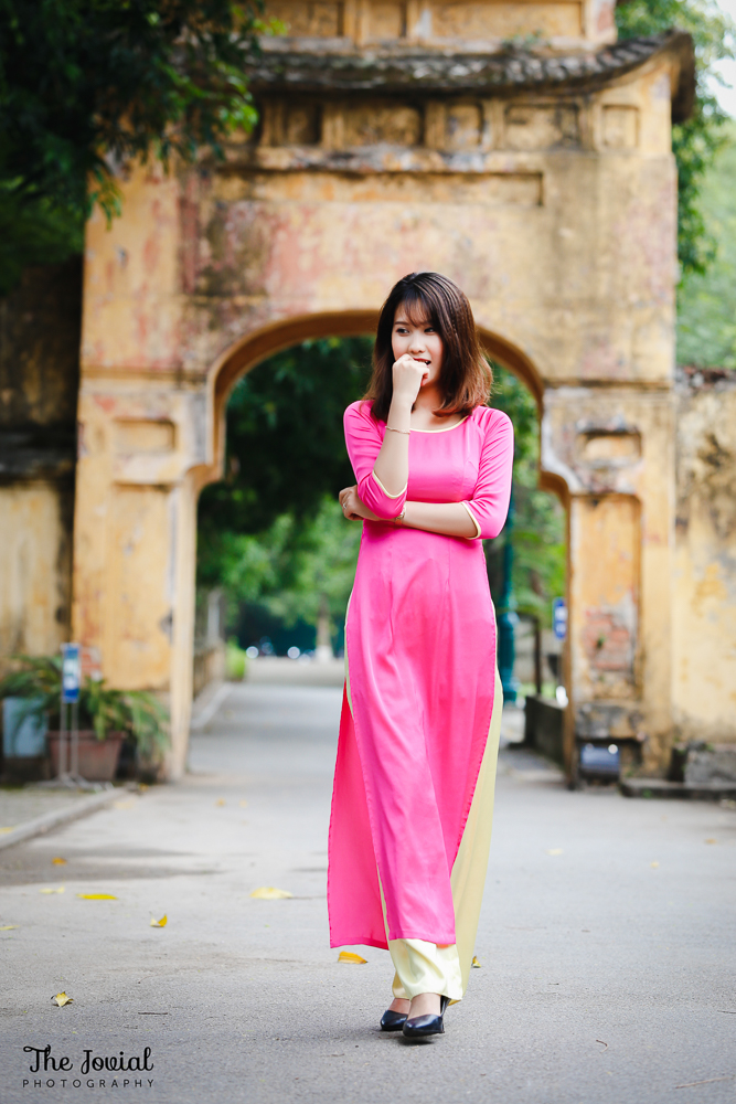 Ngoài ý nghĩa về sự lãng mạn, mơ mộng, màu hồng còn là thông điệp của hạnh phúc và tính cách lạc quan. Chính bởi lẽ đó, thiết kế áo dài kỷ yếu màu hồng với chất liệu gấm của The Jovial Studio luôn là một trong những lựa chọn hàng đầu của những cô gái học sinh, sinh viên khi có nhu cầu thuê áo dài chụp ảnh.