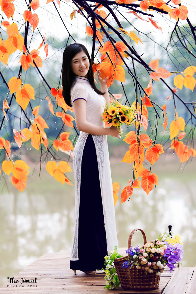 Bạn có thể sử dụng bó hoa hồng vàng hoặc hoa hướng dương để tạo dáng khi chụp ảnh cùng áo dài nữ. Về cách trang điểm, bạn nên tận dụng tối đa cách trang điểm nhẹ nhàng bởi bản thân màu sắc đã giúp tôn da rất nhiều. Về kiểu tóc bạn có thể tùy chọn các kiểu tóc tết, búi hoặc thể thả tự nhiên đều rất hợp với áo dài thiết kế đặc biệt này. Bạn muốn trang điểm rẻ đẹp thì hãy đến với The Jovial Studio nhé.