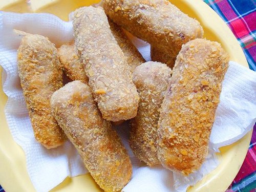 - Lăn quả trứng khoai môn đó qua bột mì sao cho bột mì phủ kín chiếc bánh, sau đó lăn tiếp qua bát trứng và thau bột chiên xù.
