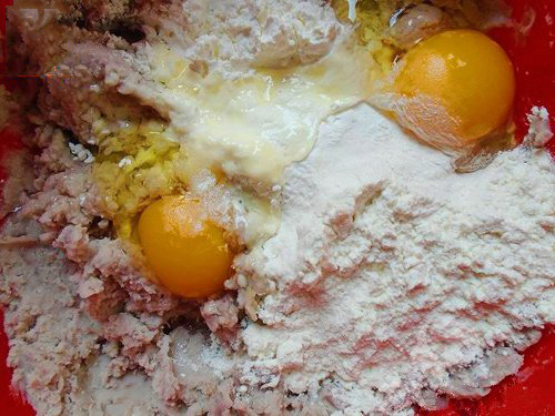 - Đổ bột mì ra một chiếc thau, đánh tan quả trứng vào bát nhỏ.