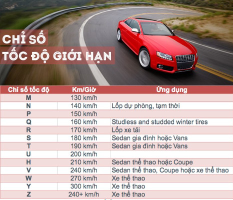Ví dụ lốp 205 / 60 R16 92V. Trong đó, V là chỉ số tốc độ giới hạn tối đa mà lốp có thể hoạt động được là 220km/h. Ngoài ra bạn có thể thấy ký tự từ M đến Z tương ứng chỉ số tốc độ giới hạn tối đa từ 130 đến hơn 240km/n.