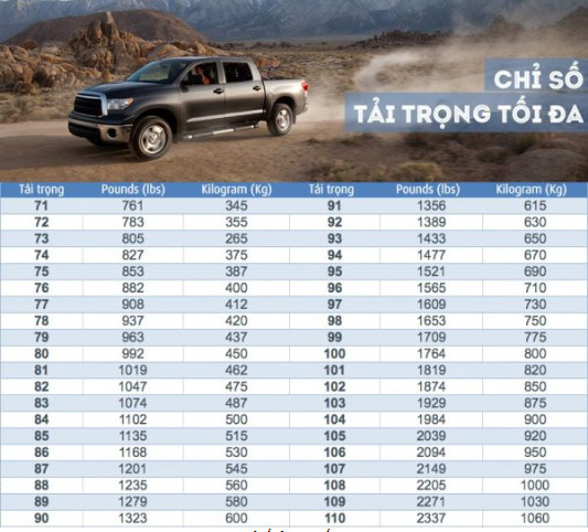 Kể từ năm 1991 cho đến nay, tắt cả các lốp xe đều phải ghi chỉ số tải trọng giới hạn. Ví dụ 205/ 60 R16 92V có chỉ số tải trọng giới hạn là 92 tương đương với 630kg. Đa phần chỉ số tải trọng của lốp giới hạn trong khoảng từ 71 đến 110 tương ứng với tải trọng chịu đựng của lốp từ 345kg đến 1060Kg.