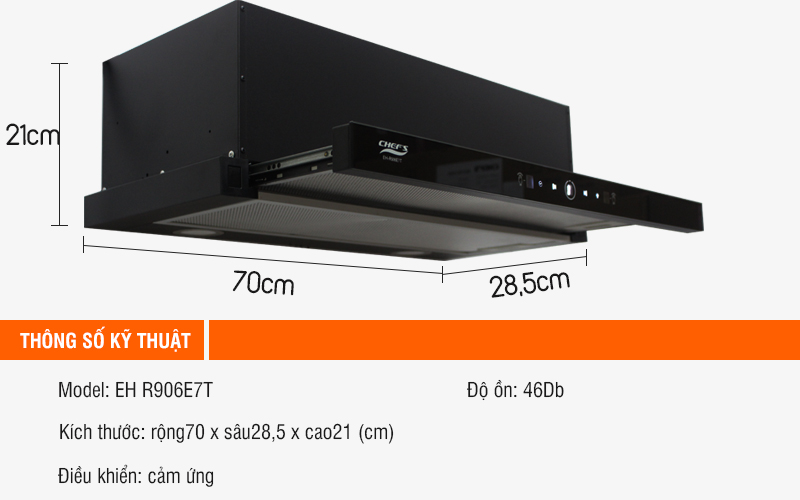 Nếu trước đây muốn kiếm một chiếc hút mùi âm tủ toàn thân màu đen đã khó, lại là dòng cảm ứng thì càng khó hơn thì nay Chefs ra cho mắt mẫu sản phẩm vừa cảm ứng lại có màu đen mà nhiều người đang tìm kiếm, lại có thêm chức năng mới vẫy tay. Máy hút mùi Chefs 906E7T có 3 mức công suất được hiển thị ỏ chính giữa hút, đèn led sáng nhin càng nổi, các hướng dẫn sử dụng đều có ở trên màn hình hiển thị, cực kì đầy đủ và chi tiết, không khó kể cả cho người mới sử dụng. Đèn LED chiếu sáng cũng được thiết kế thành đèn trắng thay vì đèn vàng như nhiều mẫu cũ, dễ nhìn và sáng hơn rất nhiều, bóng lại dễ thay thế cho người dùng, lưới cũng dễ vệ sinh chỉ cần ngâm nước nóng để tan dầu mỡ là sạch sẽ. Các mắt lưới nhỏ khiến dầu mỡ cũng khó bám được vào bên trong. Thân máy thiết kế cũng không quá cao, phù hợp với đầy đủ các gia đình. Tốc độ hút đạt 650m3/h, độ ồn cực nhỏ, chỉ <48dB, người dùng có thể đên trực tiếp Showroom để trải nghiệm sản phẩm và nghe độ ồn để kiểm chứng.
