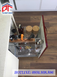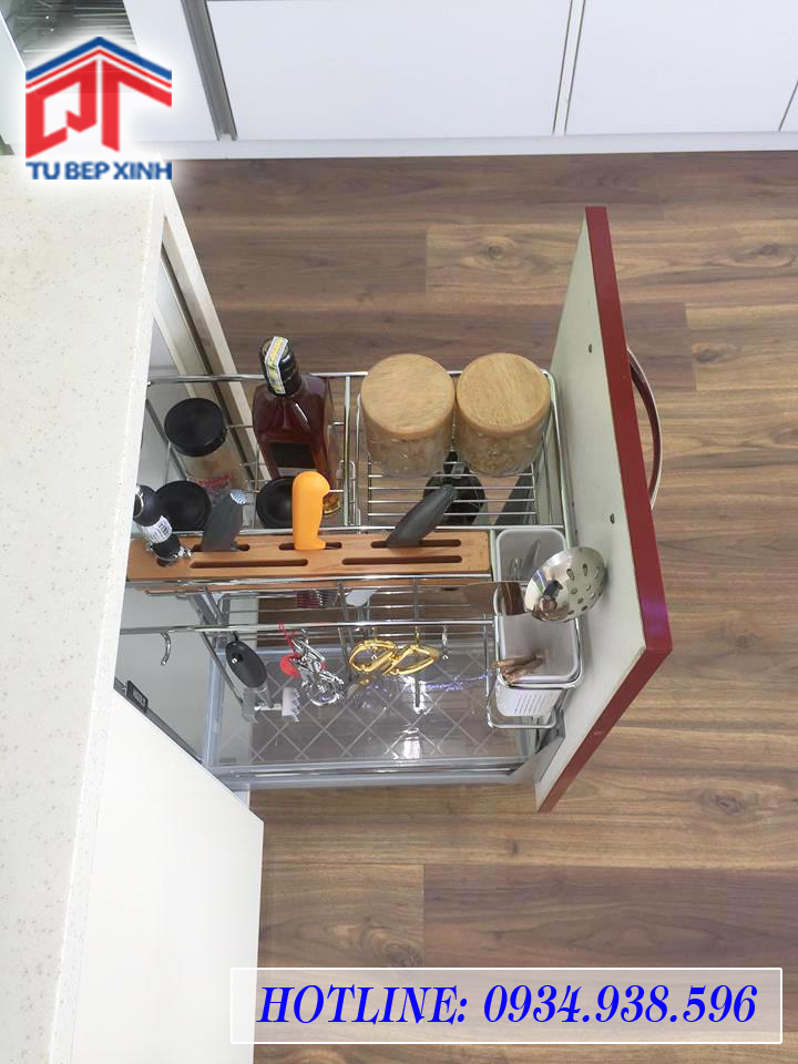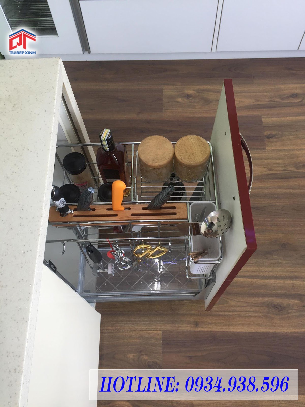 Là chiếc kệ đa tiện ích, chứa đựng gia vị, dao, kéo, thớt và cả muỗng, đũa...