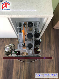 Được thiết kế thông minh và khoa học, kệ vừa có chức năng đựng gia vị, vừa có thể chứa các dụng cụ làm bếp như dao, kéo, muỗng, đũa một cách thật gọn gàng, ngăn nắp.
