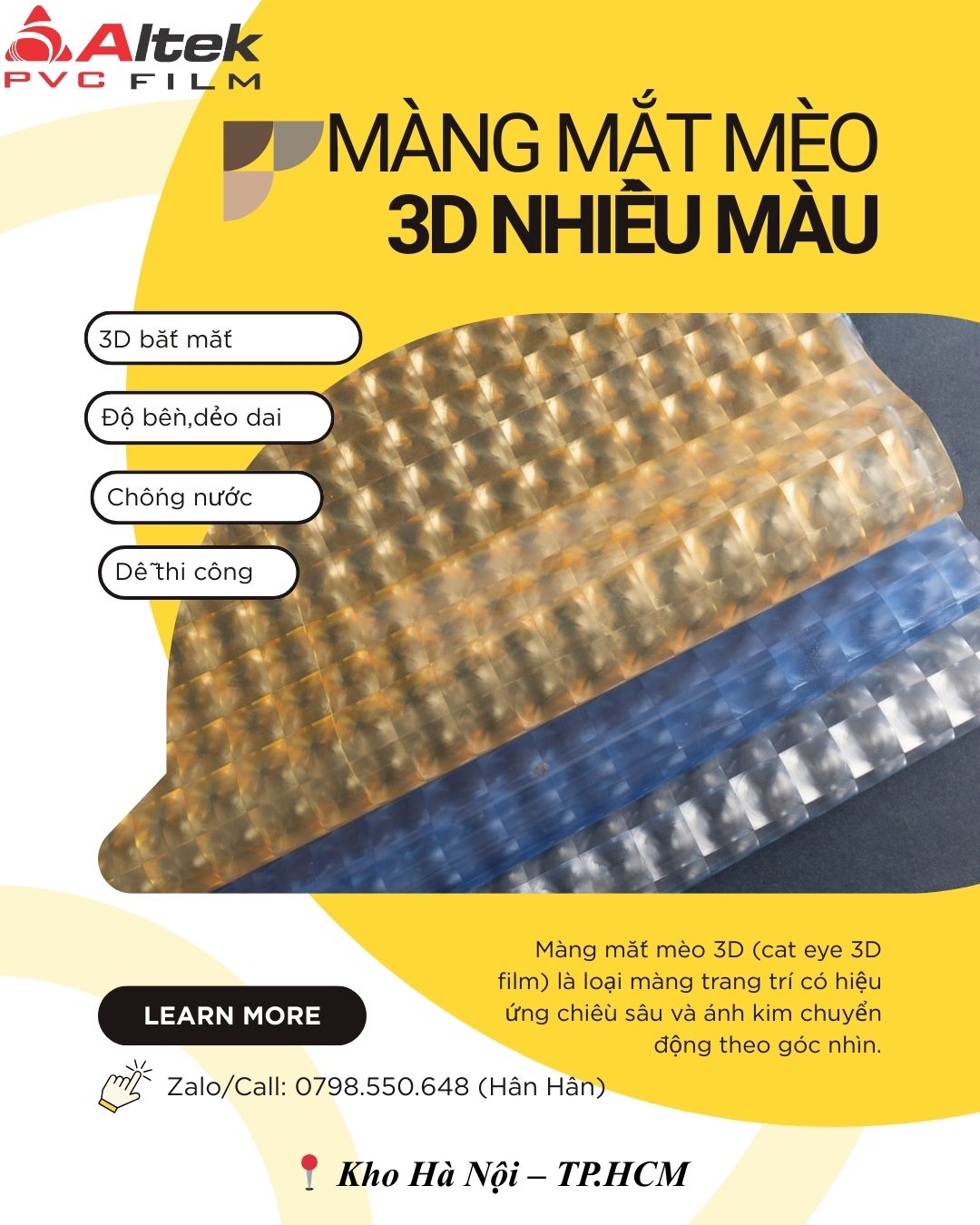 Màng mắt mèo 3D (cat eye 3D film) là loại màng trang trí có hiệu ứng chiều sâu và ánh kim chuyển động theo góc nhìn. Công dụng chính gồm: