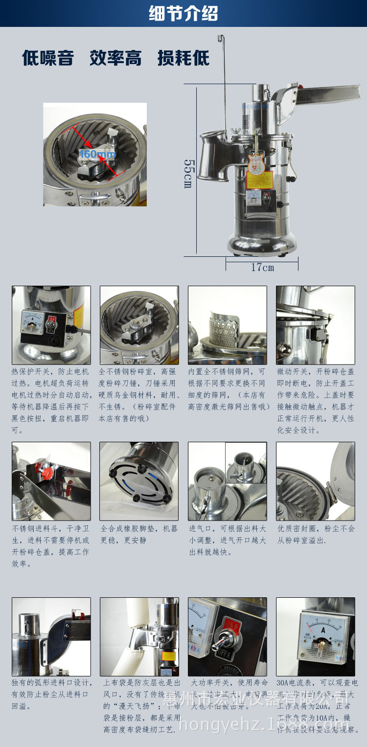 Máy nghiền được trang bị với lưới dọc bên trong và có thể nghiền các nguyên liệu thành bột độ mịn khác nhau tùy theo kích thước lưới. Bột mịn được lấy ra thông qua túi vải. cấu trúc đặc biệt quay mà không rung, tiếng ồn thấp.