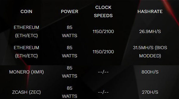 Tốc độ mining của card màn hình RX 480 8GB với đồng ETH là 26.9mh/s, 31.5 khi mod bios, XMR 800h/s và ZEC 270H/s.