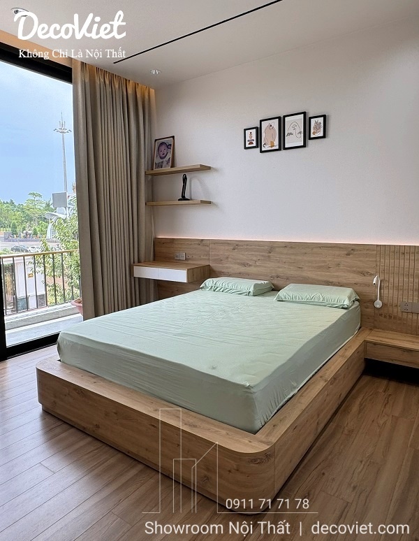 gi.ường ngủ lớn được đặt cân đối giữa tab đầu gi.ường và bàn trang điểm, tạo sự hài hòa trong không gian. Tủ quần áo gỗ thiết kế kịch trần giúp tăng không gian lưu trữ.