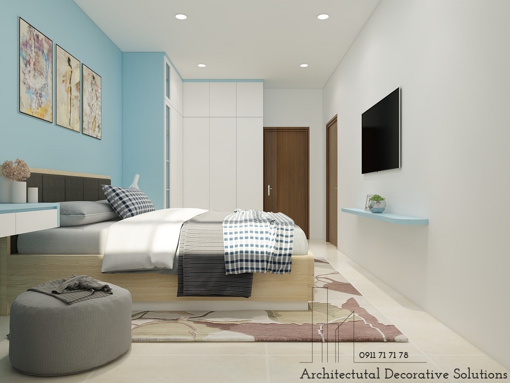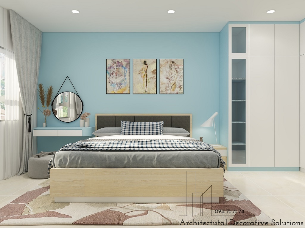 gi.ường ngủ được thiết kế đơn giản, dùng tone màu xanh trắng của tường kết hợp với gam màu gỗ của gi.ường ngủ, mang tới sự thanh thoát và thư giãn cho gia chủ.