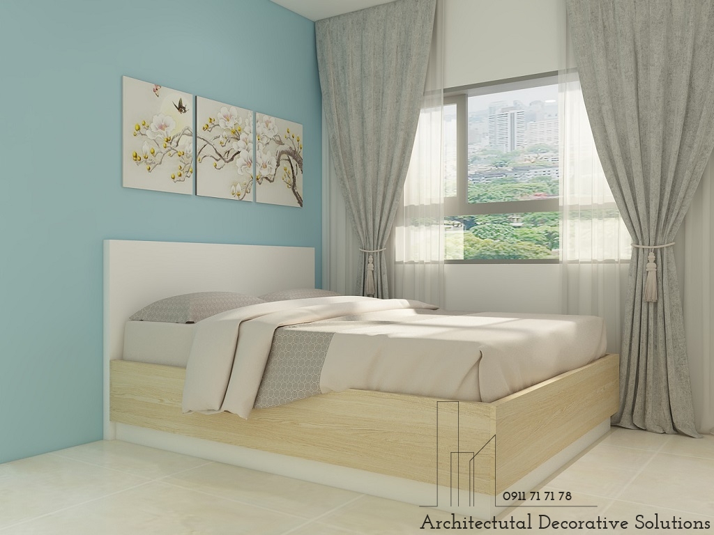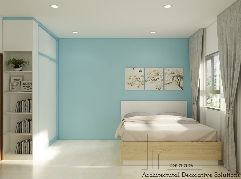Phòng ngủ được bố trí nhẹ nhàng, đơn giản điểm nhấn nổi bật với tranh treo tường bắt mắt. Trend sử dụng tông xanh dương thực sự đang ngày càng được yêu thích và áp dụng thành công cho rất nhiều căn nhà. Khách hàng cũng rất hài lòng khi nhận bàn giao căn nhà tông xanh dương này. Ưu điểm dễ thấy là cảm giác thanh mát, dịu nhẹ ngay từ ánh nhìn đầu tiên.