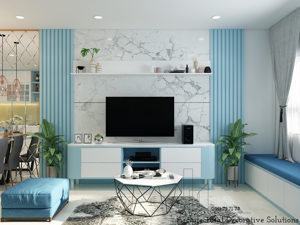 Kệ tivi thiết kế đơn giản nhưng đầy đủ công năng. Sự phối hợp giữa 2 màu xanh và trắng tạo nên sự thoải mái và hiện đại nhưng không kém phần tinh tế.