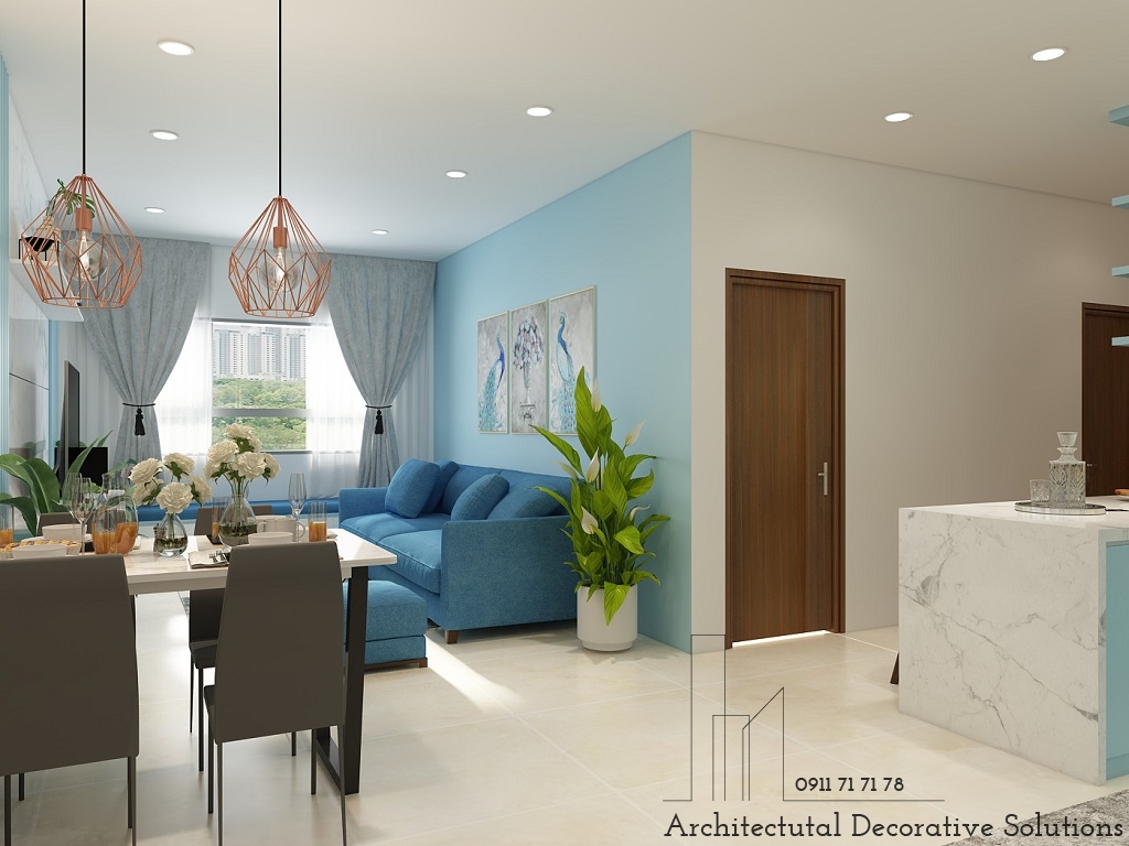 Luôn mang trong mình một sự nhẹ nhàng, cuốn hút thanh mát nên màu xanh dương cực kỳ hợp cho các căn nhà chung cư. Màu xanh vừa tạo cảm giác rộng mở không gian, vừa tạo nên sự dễ chịu thư thái cho chủ nhân căn nhà.