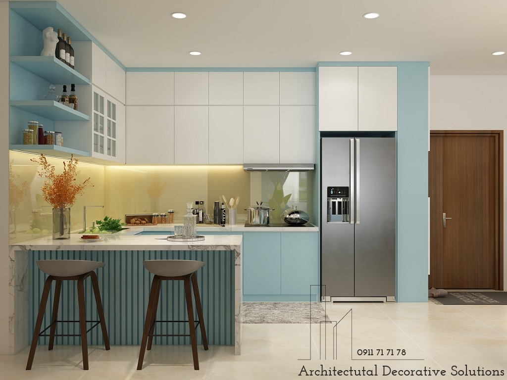 Không gian nhà bếp bắt mắt với hệ tủ được kết hợp từ 2 màu xanh dương nhạt và trắng.
