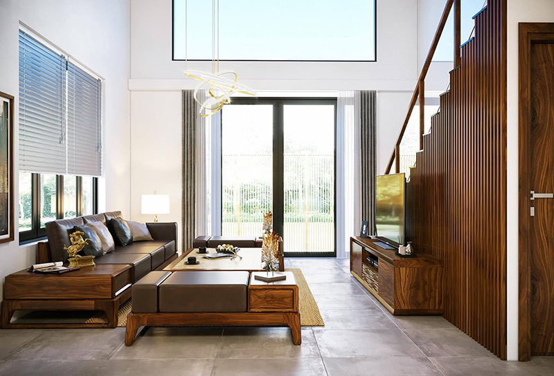 Không gian phòng khách không quá khác lạ với các không gian nhà phố khác với cách bố trí sofa gỗ óc chó thông thường giúp không gian thêm rộng thoáng, dưới tầng gác lửng là không gian bếp ăn, gác lửng được để phòng thờ.