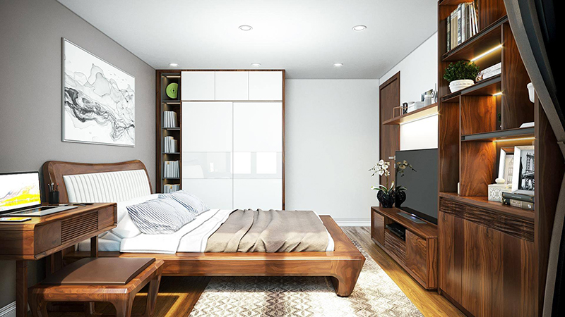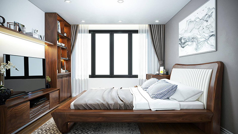 Với hệ tủ kệ tivi gỗ óc chó và tủ chứa đồ được thiết kế phù hợp với không gian phòng ngủ, toàn bộ không gian được sử dụng gỗ óc chó: gi.ường, tủ, kệ toàn bộ không gian được kết hợp hài hòa cân đối.