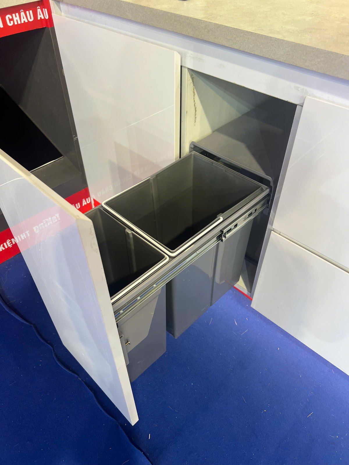 Thiết kế 2 ngăn riêng biệt, thuận lợi cho việc phân loại rác. Thùng rác dạng âm tủ nên không làm ảnh hưởng tới thẩm mỹ không gian bếp cũng như không để lại rác khó chịu ảnh hưởng tới không gian bếp.