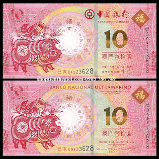 Tiền 10 dola macao con heo được phát hành bởi ngân hàng Banco da China và Banco Nacional Ultramarino Macao.