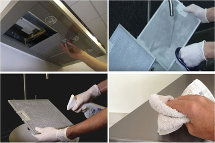 Bộ lọc là phần quan trọng máy hút mùi loại bỏ bụi bẩn, dầu mỡ trong không khí. Để vệ sinh bộ lọc, bạn cần tháo bộ lọc ra khỏi máy và rửa sạch bằng nước xà phòng hoặc dung dịch rửa chén.Nếu máy hút mùi của bạn sử dụng đã lâu và dầu mỡ, bụi bẩn bám chắc thì bạn có thể ngân các tấm lọc với xà phòng. Trường hợp không vệ sinh được, bạn có thể đun sôi một nồi nước lớn với hỗn hợp 100ml dấm trắng và muỗng canh Baking Soda. Sau đó, ngâm tấm lọc với dung dịch trên khoảng 15 phút, cọ rửa và phơi khô tấm lọc trước khi lắp vào máy.