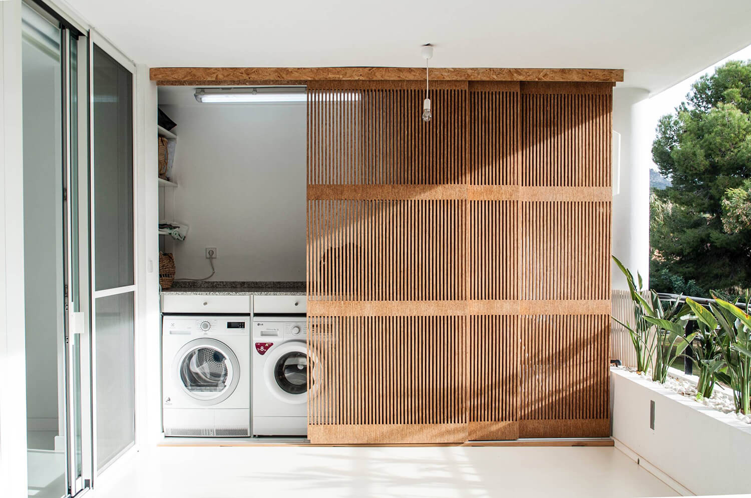 Hạn chế của những căn hộ chung cư hiện nay là có diện tích nhỏ, nên để tận dụng hết công năng nên nhiều gia chủ cũng biến khu vực này thành nơi giặt phơi, được che chắn bằng lam gỗ, vừa đầy đủ tiện nghi mà không mất đi vẻ đẹp của ban công